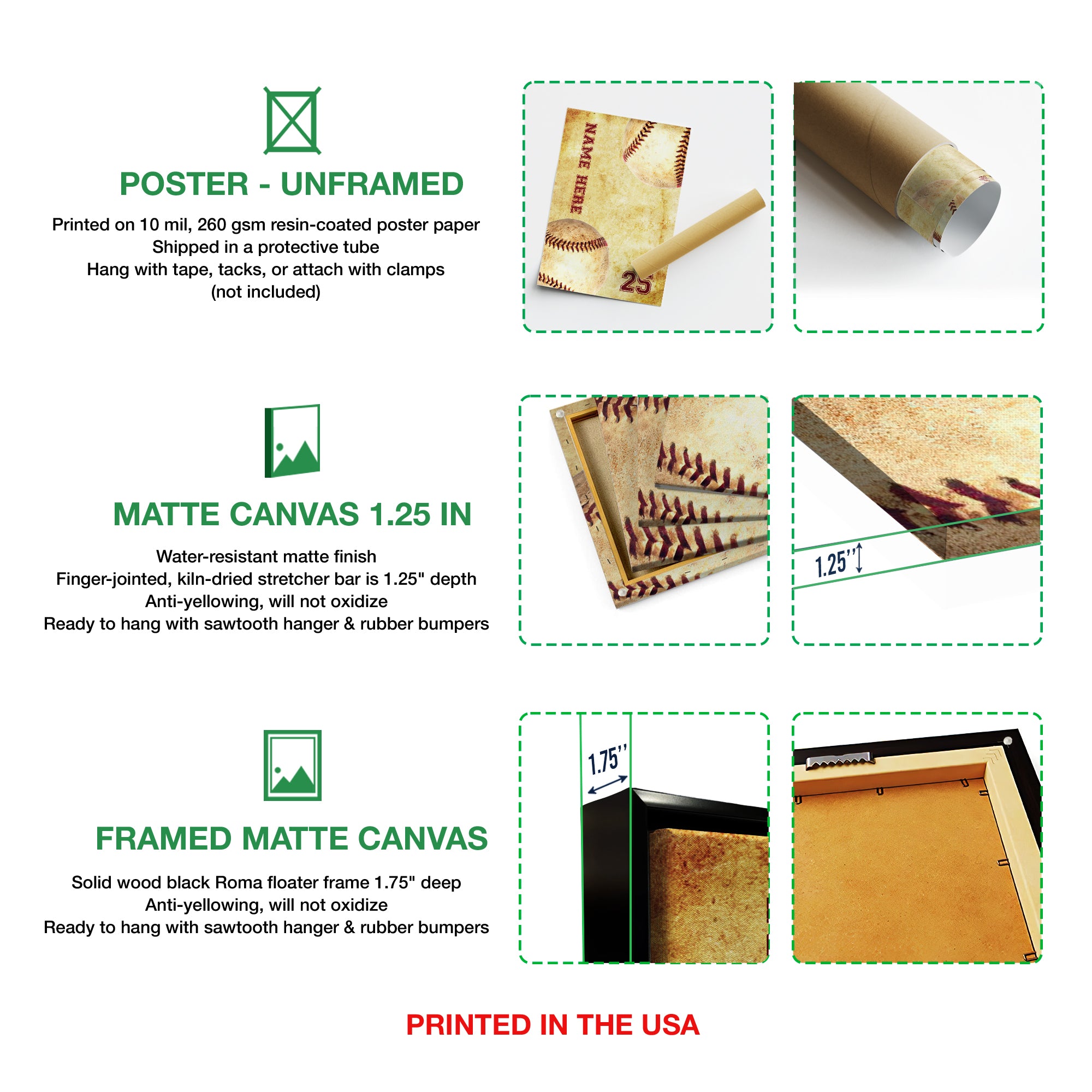 - Framed Matte Canvas: Our framed matte canvas is an excellent choice for anyone looking to make a statement about their personality. The canvas is printed using UL Certified GREENGUARD GOLD Ink and features a museum-quality archival canvas that will not oxidize or yellow over time. The stretcher bar is made of 100% renewable, kiln-dried, knot-free, finger-jointed wood, and the solid wood Black Roma floater frame is 1.75″ deep. The canvas comes ready to hang with a sawtooth and rubber bumpers.