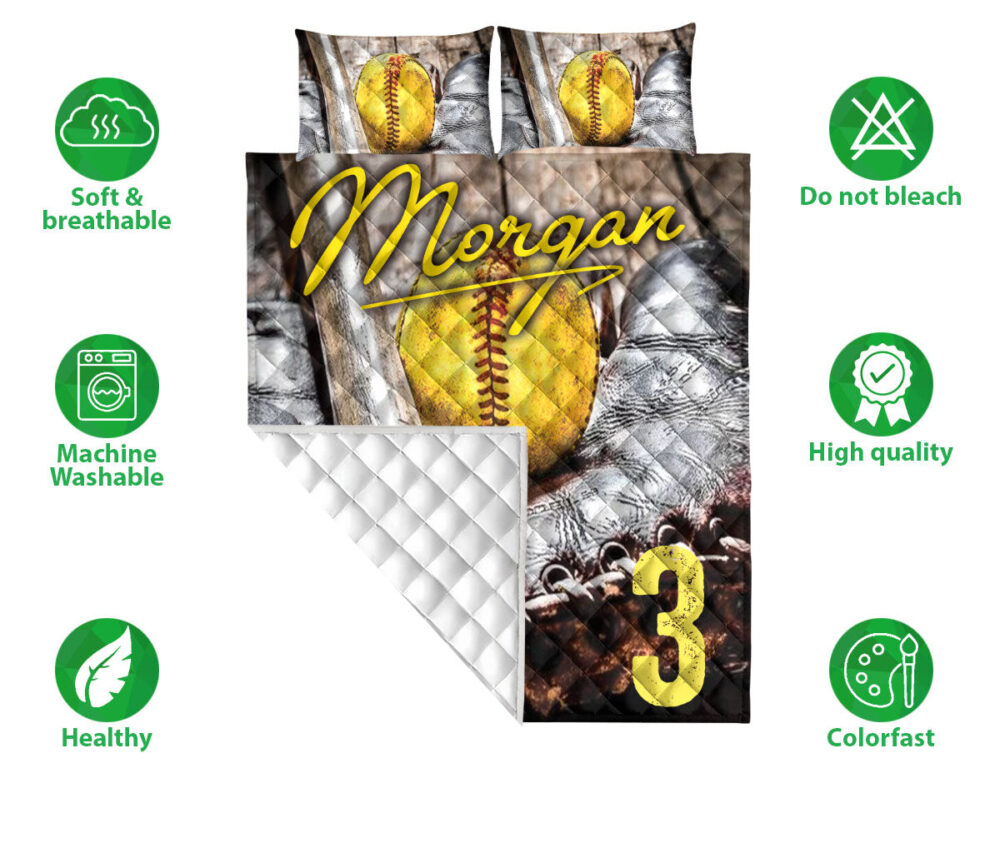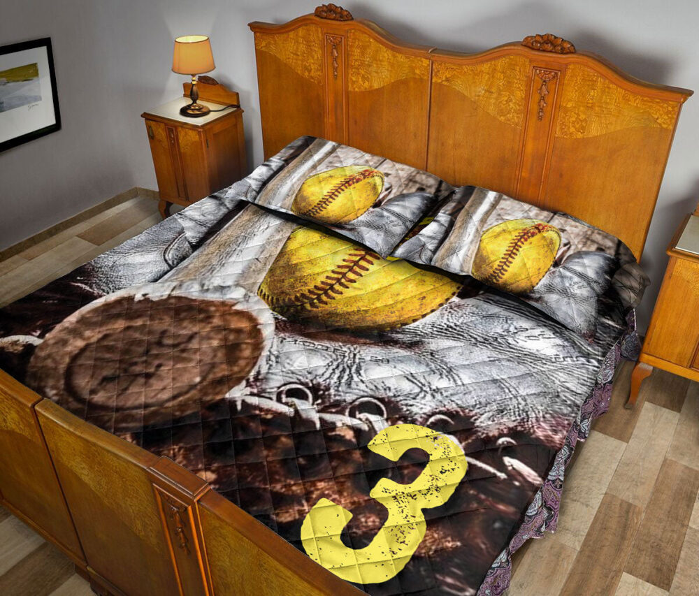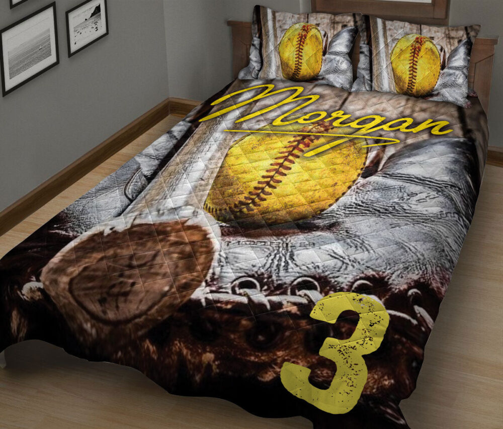 Personalized Softball Quilt Set, Old School Ball Quilt Blanket With Pillowcases, Custom Name Quilt Bedding Set
