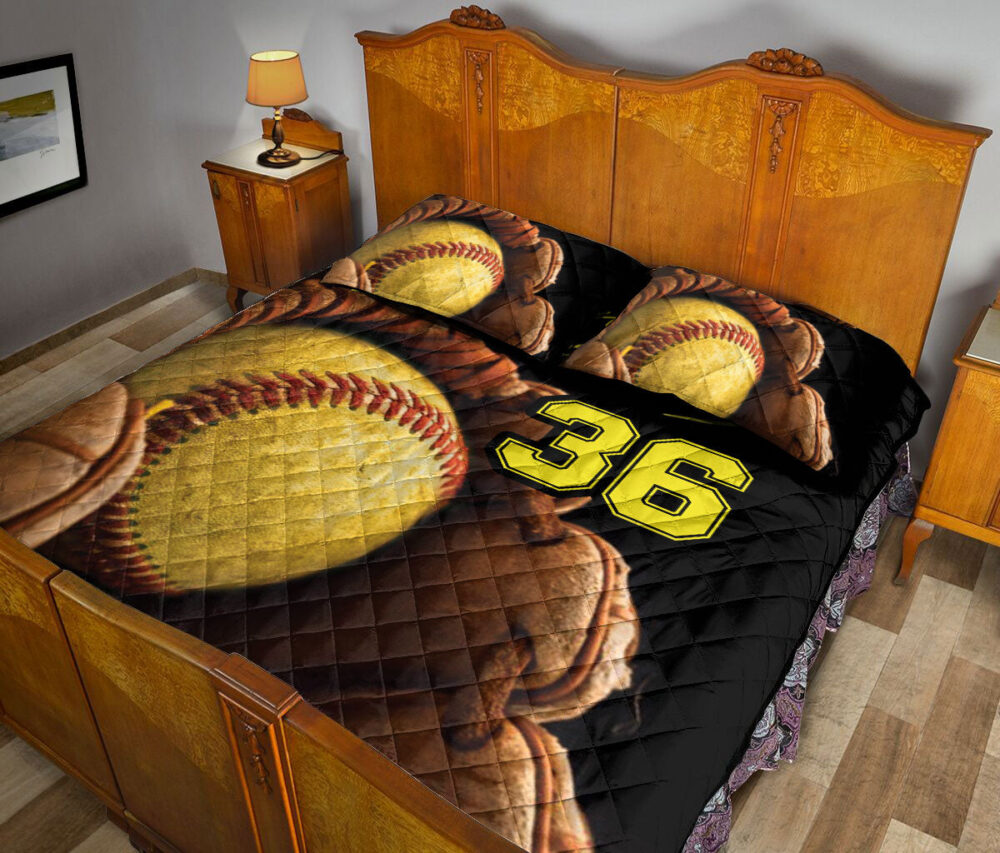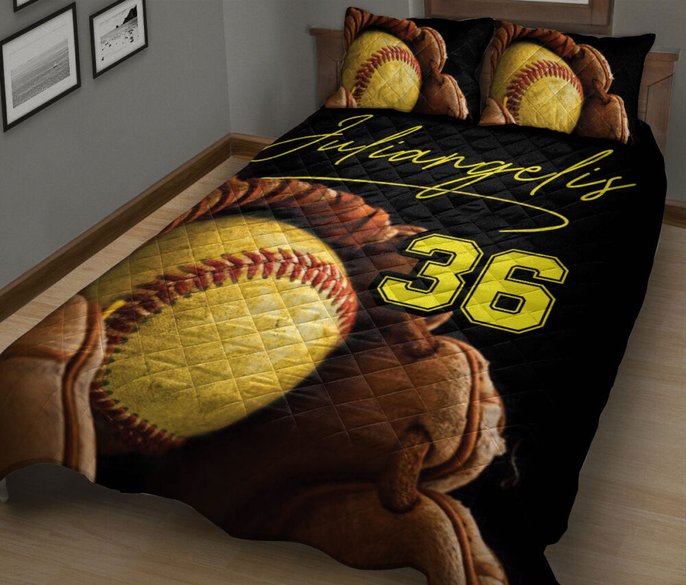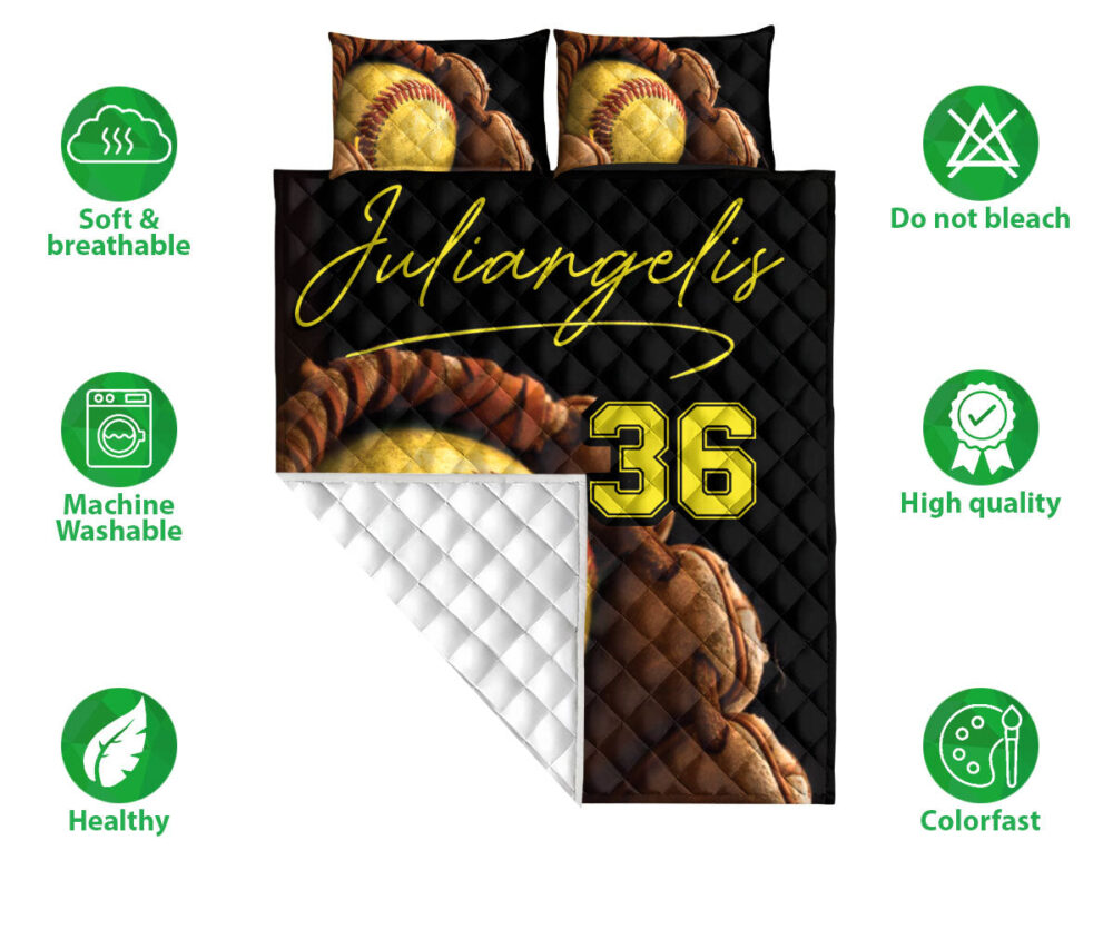 Personalized Softball Quilt Set, Softball Glove And Ball Quilt Blanket With Pillowcases, Custom Name Quilt Bedding Set