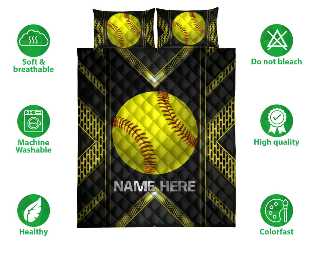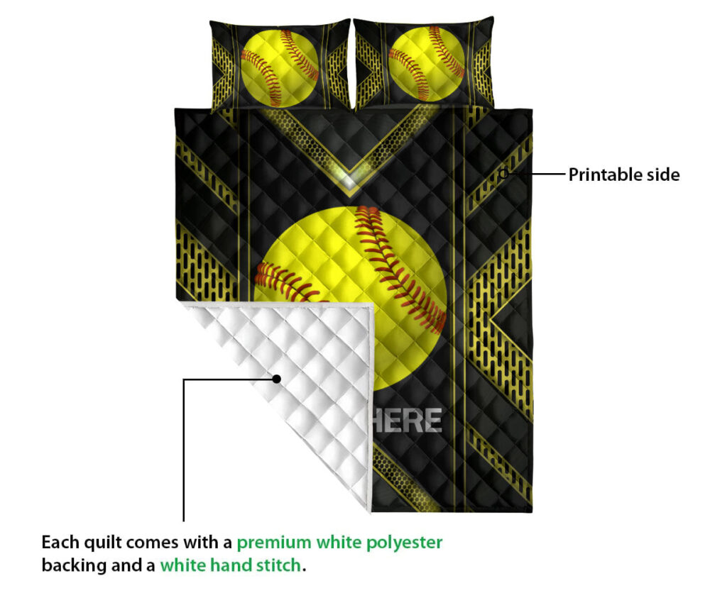 Personalized Softball Quilt Set, Softball Yellow Ball Carbon Quilt Blanket With Pillowcases, Custom Name Quilt Bedding Set