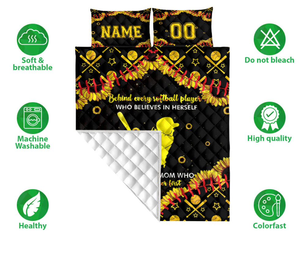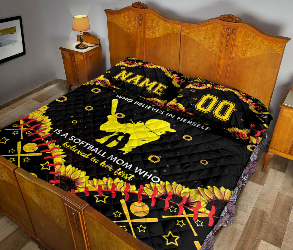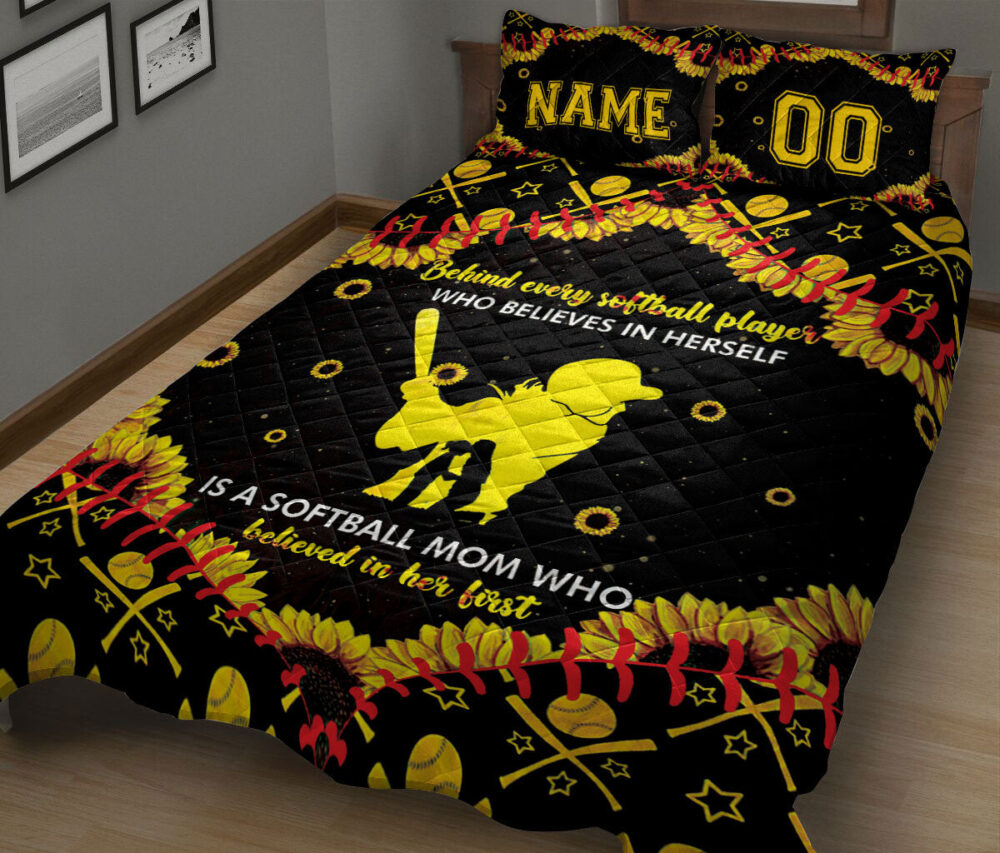 Personalized Softball Quilt Set, Sunflower Softball Girl Quilt Blanket With Pillowcases, Custom Name and Number Quilt Bedding Set