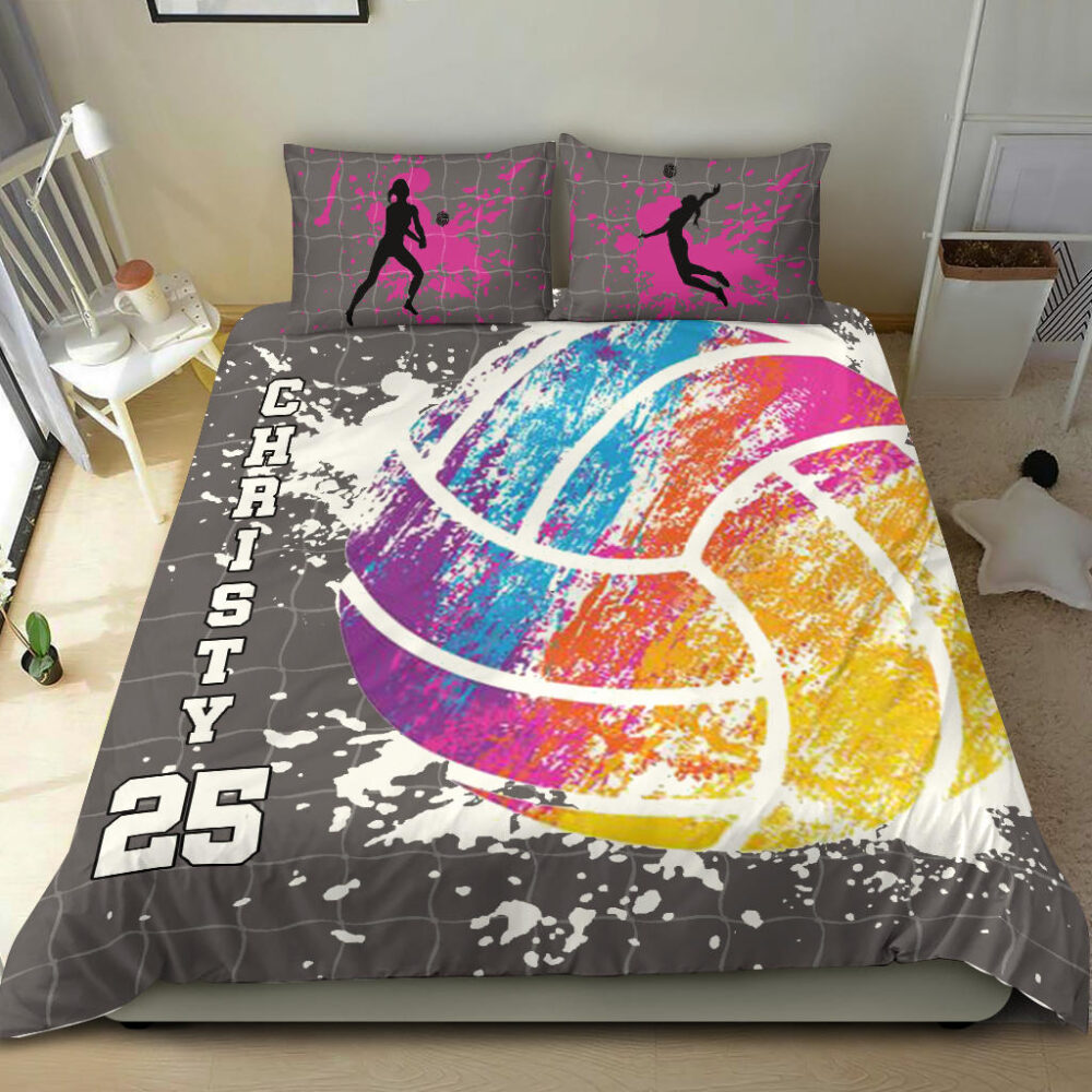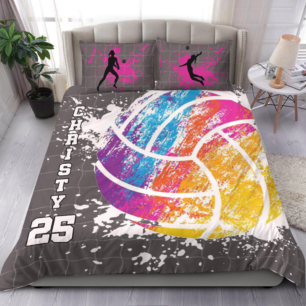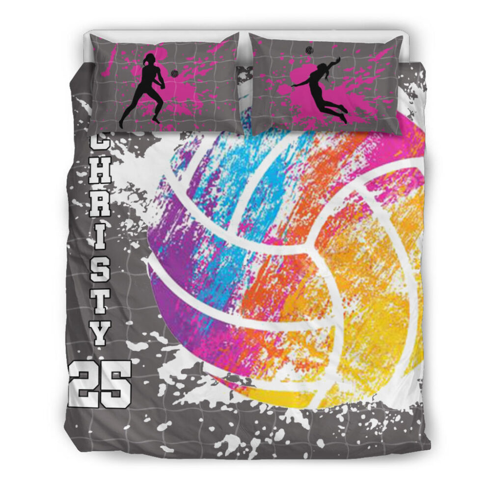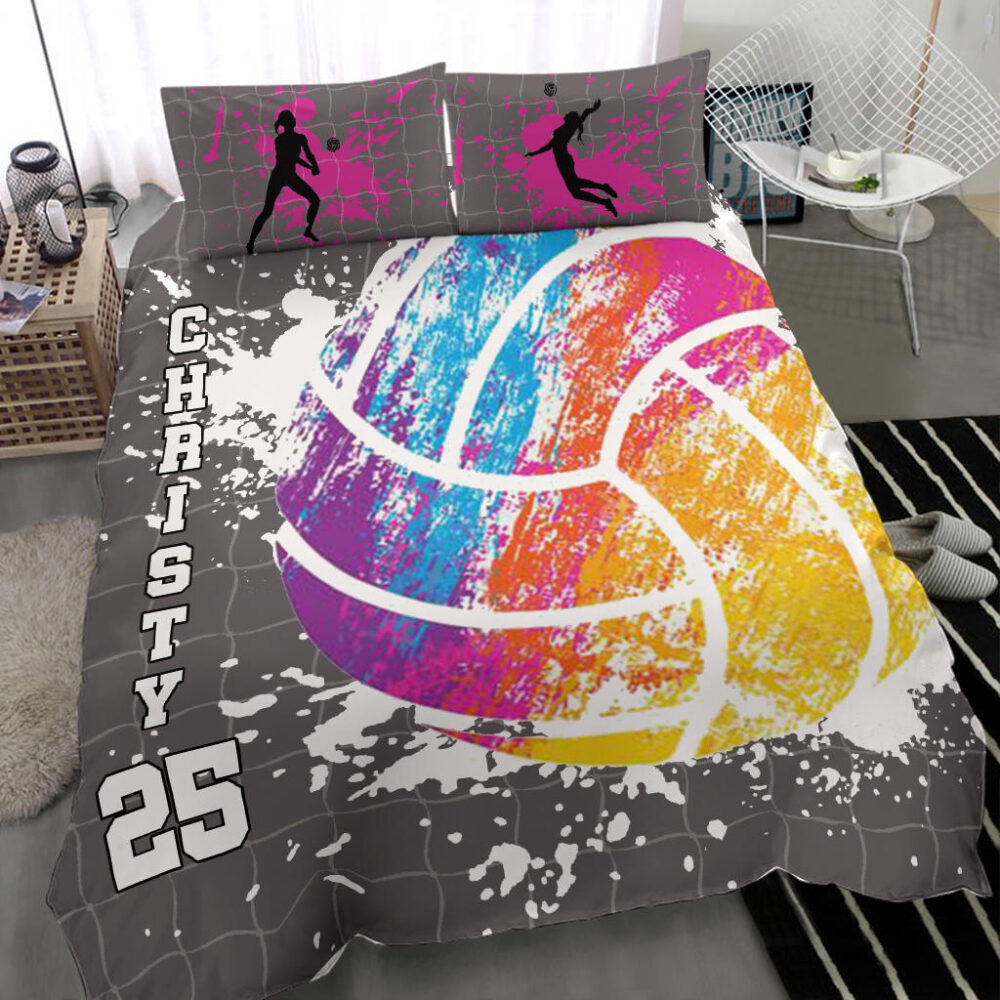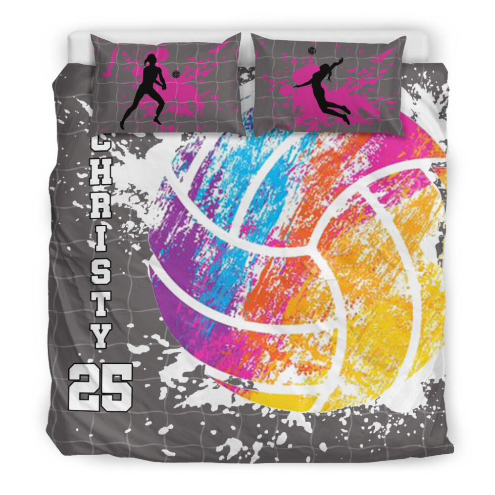 Personalized Volleyball Duvet Cover Set, Volleyball Watercolor Ball Player Gift Grey Duvet Cover & Pillowcases, Custom Name Number Bedding Set