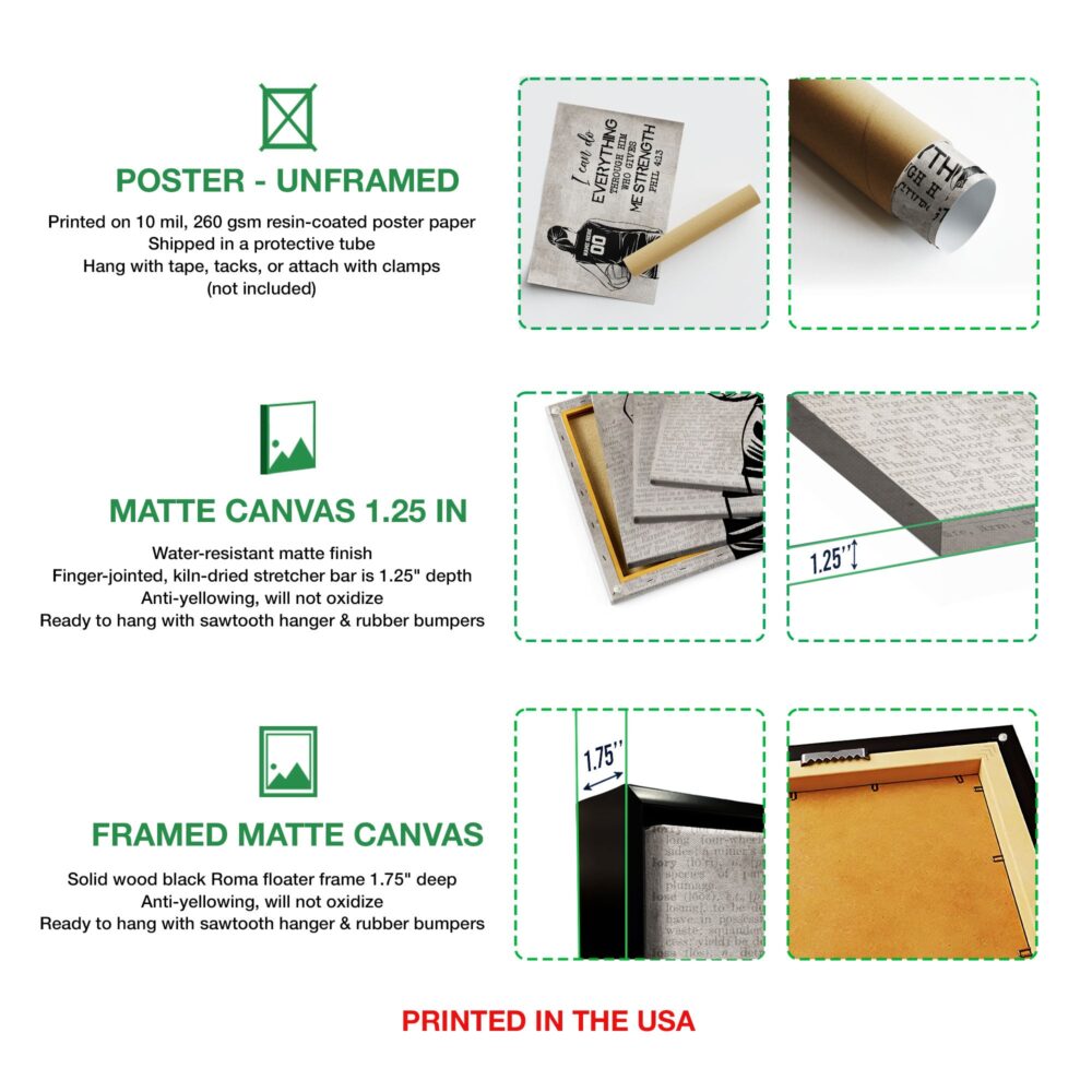 - Framed Matte Canvas: Our framed matte canvas is an excellent choice for anyone looking to make a statement about their personality. The canvas is printed using UL Certified GREENGUARD GOLD Ink and features a museum-quality archival canvas that will not oxidize or yellow over time. The stretcher bar is made of 100% renewable, kiln-dried, knot-free, finger-jointed wood, and the solid wood Black Roma floater frame is 1.75″ deep. The canvas comes ready to hang with a sawtooth and rubber bumpers.