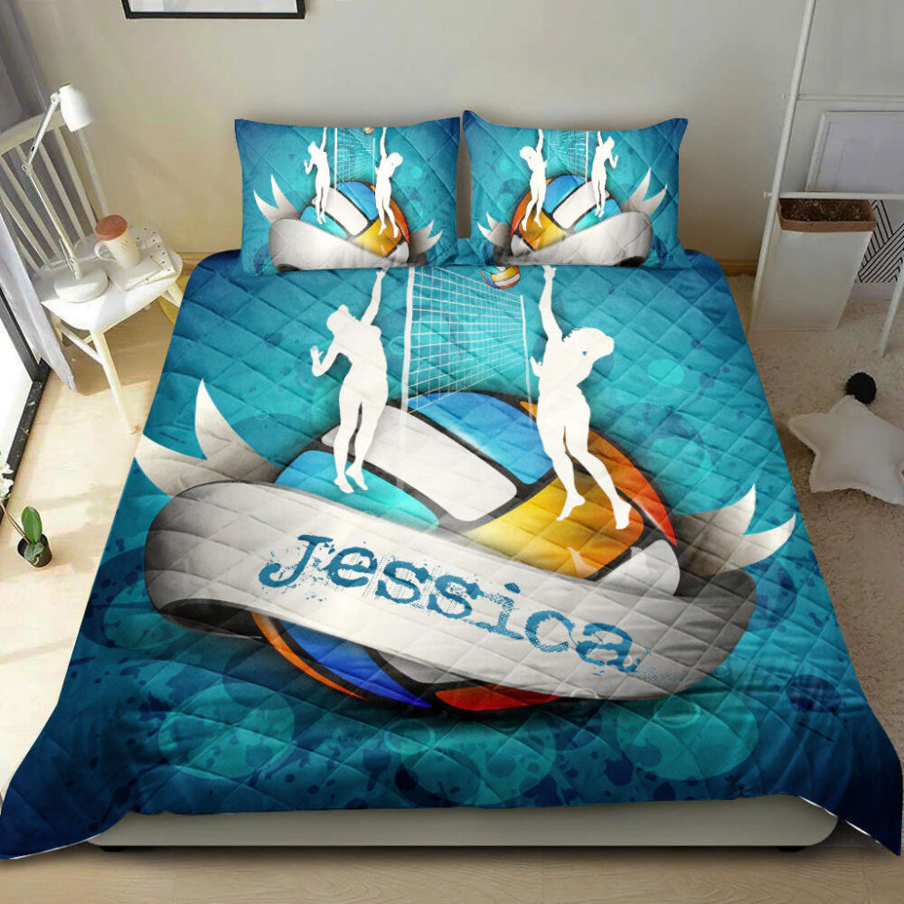 Personalized Volleyball Quilt Set, Volleyball Girl Blue Turquoise Quilt Blanket With Pillowcases, Custom Name Quilt Bedding Set