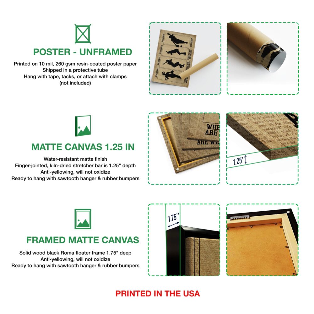 - Framed Matte Canvas: Our framed matte canvas is an excellent choice for anyone looking to make a statement about their personality. The canvas is printed using UL Certified GREENGUARD GOLD Ink and features a museum-quality archival canvas that will not oxidize or yellow over time. The stretcher bar is made of 100% renewable, kiln-dried, knot-free, finger-jointed wood, and the solid wood Black Roma floater frame is 1.75″ deep. The canvas comes ready to hang with a sawtooth and rubber bumpers.