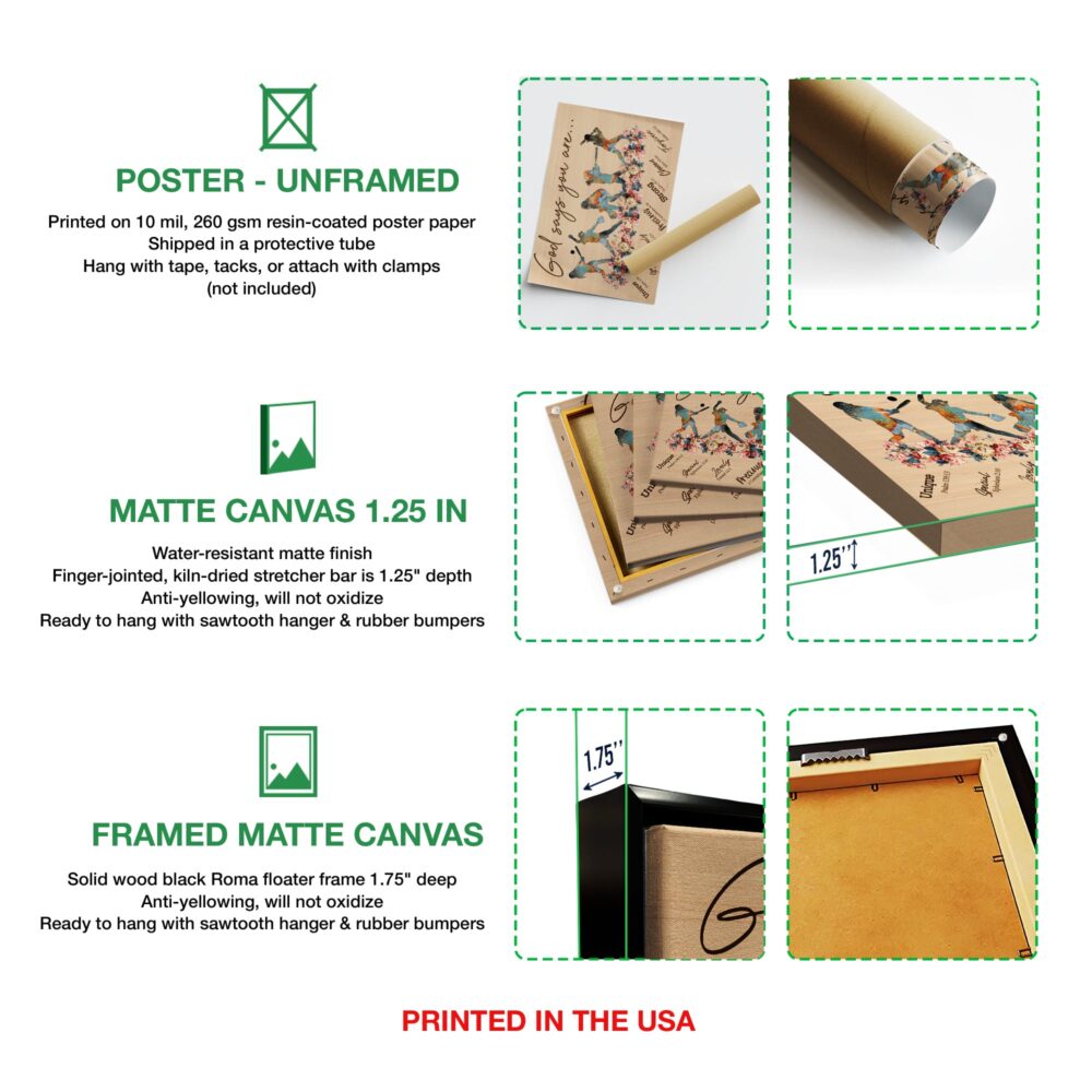 - Framed Matte Canvas: Our framed matte canvas is an excellent choice for anyone looking to make a statement about their personality. The canvas is printed using UL Certified GREENGUARD GOLD Ink and features a museum-quality archival canvas that will not oxidize or yellow over time. The stretcher bar is made of 100% renewable, kiln-dried, knot-free, finger-jointed wood, and the solid wood Black Roma floater frame is 1.75″ deep. The canvas comes ready to hang with a sawtooth and rubber bumpers.